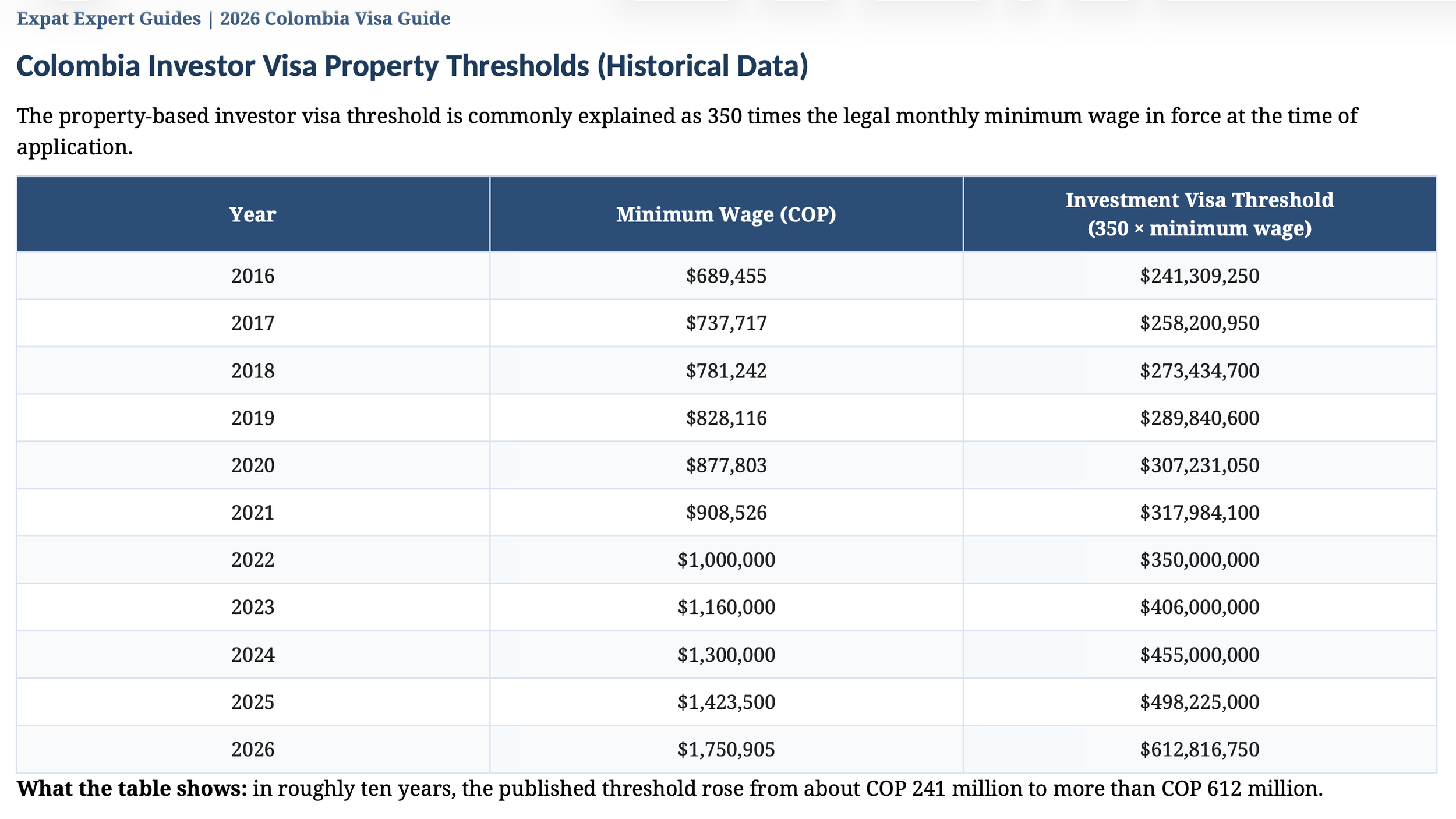 Colombian Investor Visa Property Thresholds Historical Data Last 10 Years