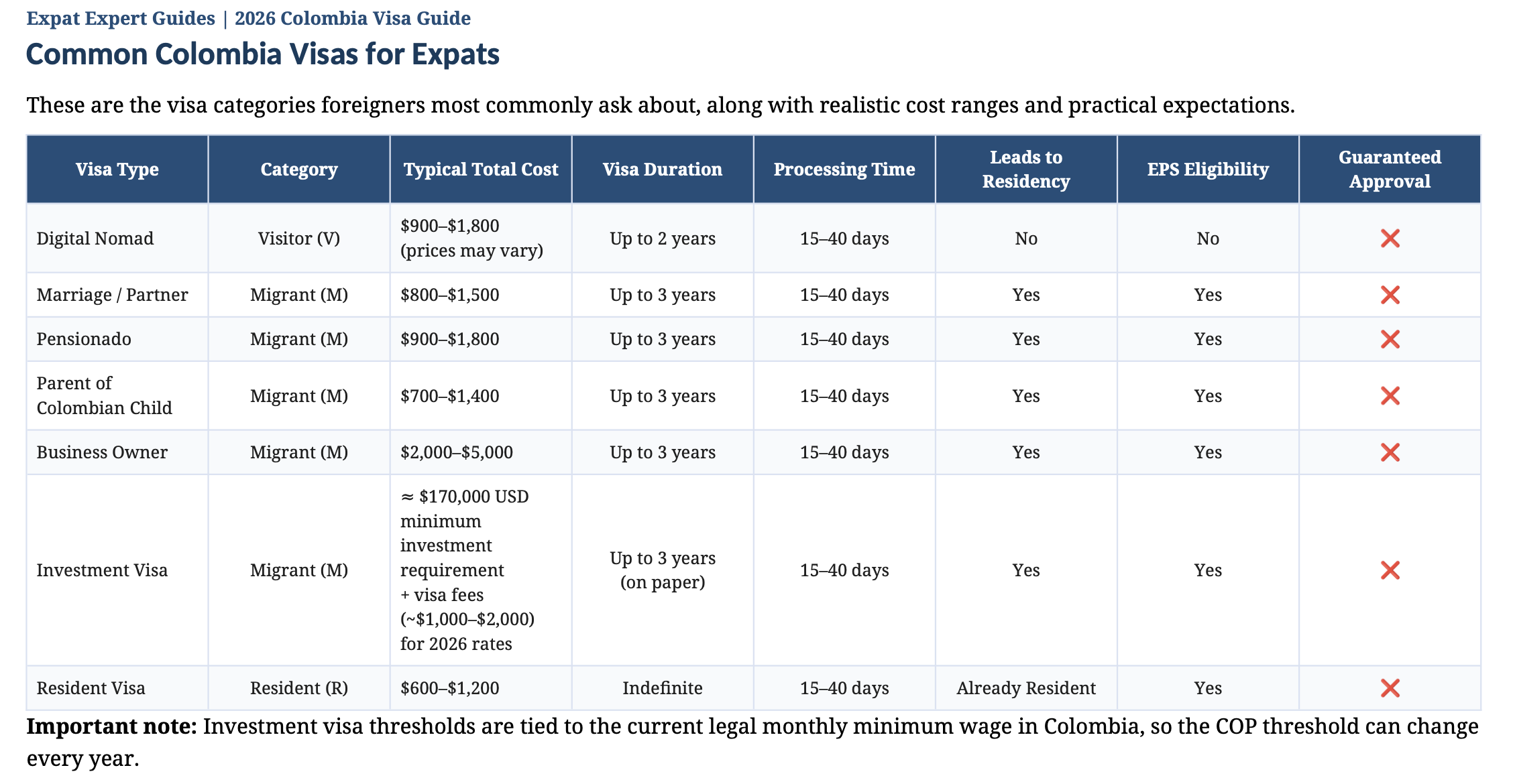 This Colombia visa guide explains everything expats need to know about Colombia visa requirements, visa costs, processing times, and how to apply for a Colombia investor visa in 2026.