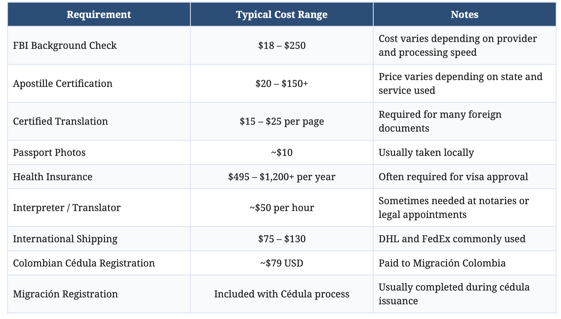 Range of costs in Colombia for documentation that may be asked while applying for a visa.